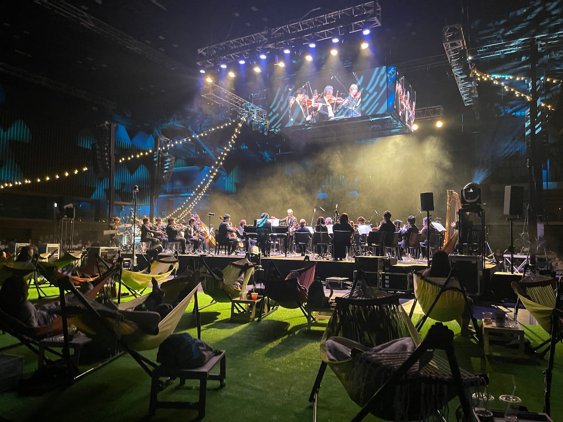 会場の扉を開けると、そこにはまるでキャンプ場のような、非日常の空間が広がっています。頭上にはやわらかな灯りのライトがともり、芝生の上にはクッションソファやハンモック、そして快適なリクライニングチェアが整然と並びます。気軽に楽しめるのに贅沢な空間が、来場者をやさしく包み込みました。