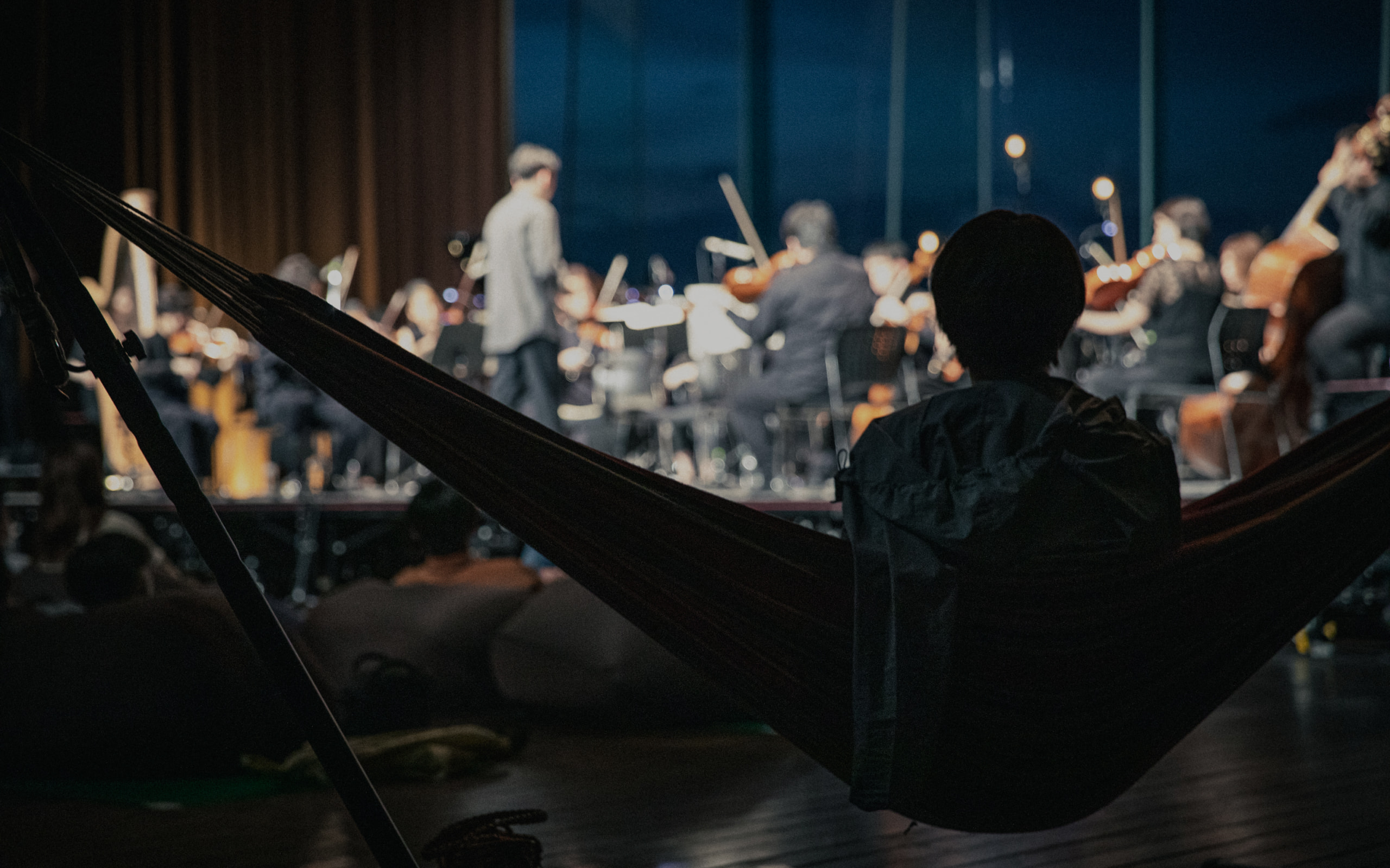 ビーズクッションに寝そべり、オーケストラの目の前で生演奏を浴びることができる、臨場感たっぷりのお席です。