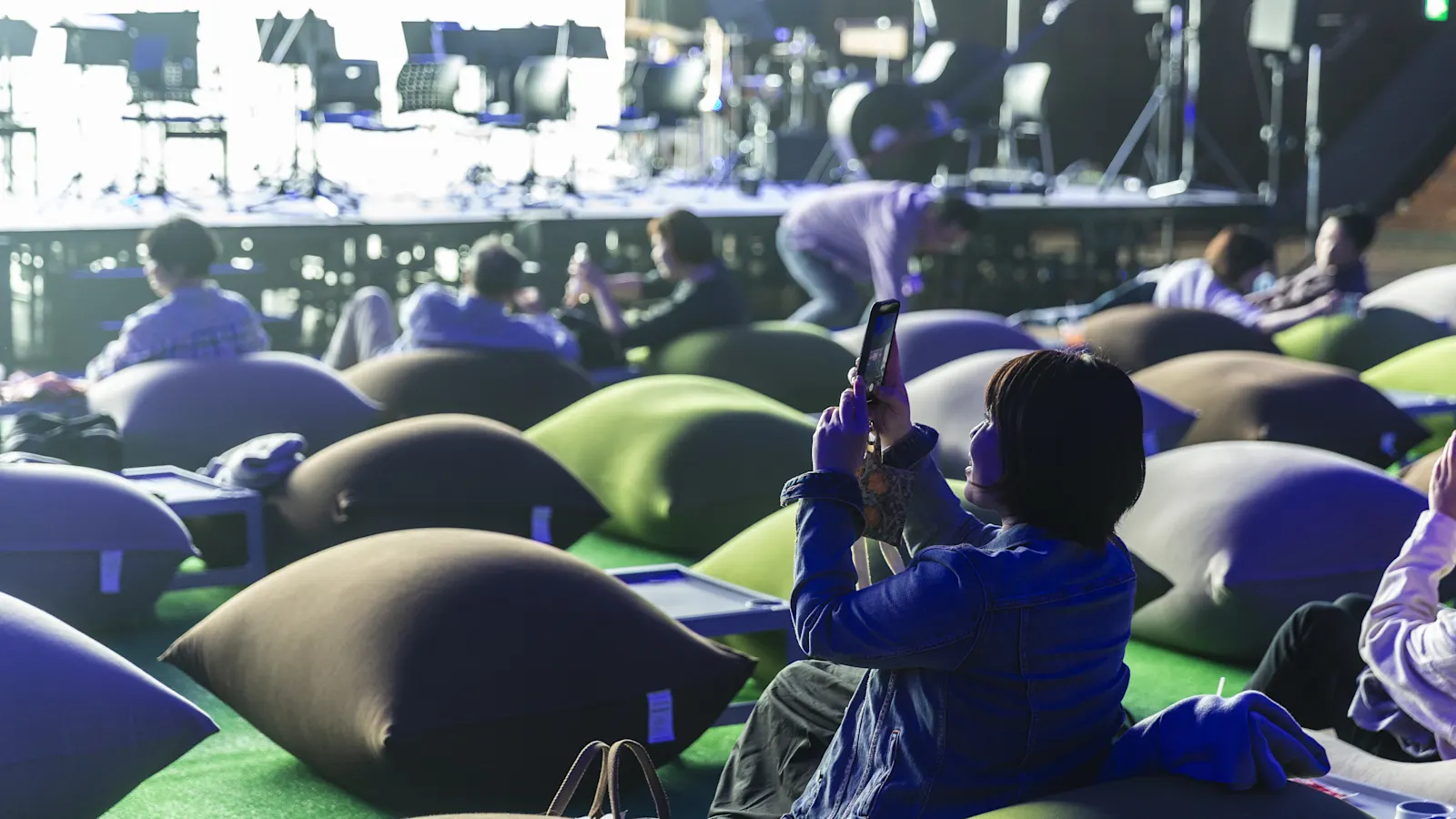 ステージ正面にビーズクッションが並んだ、目の前で生演奏を浴びることができる、臨場感たっぷりのお席です。